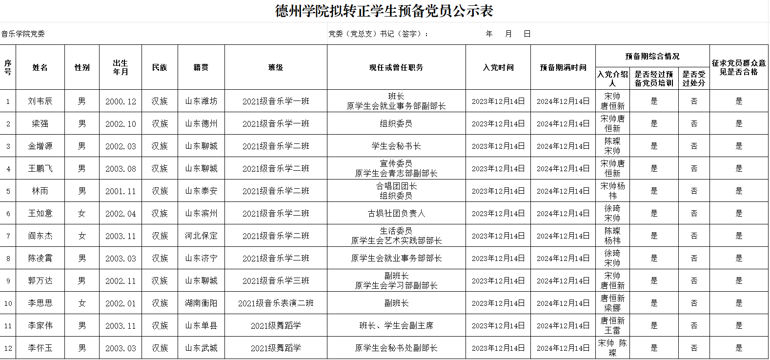 经党组织培养考察,征求党员、群众和入党介绍人意见,拟于近期讨论刘韦辰等13名同志转为中共正式党员。为增强发展党员工作的透明度,接受党内外群众的监督,确保发展党员的质量,根据上级文件精神和《中共德州学院委员会发展党员工作实施细则》的要求,现将拟讨论转正的中共预备党员基本情况公示如下(名单附后):