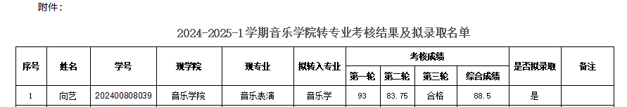 附件:2024-2025-1学期音乐学院转专业考核结果及拟录取名单