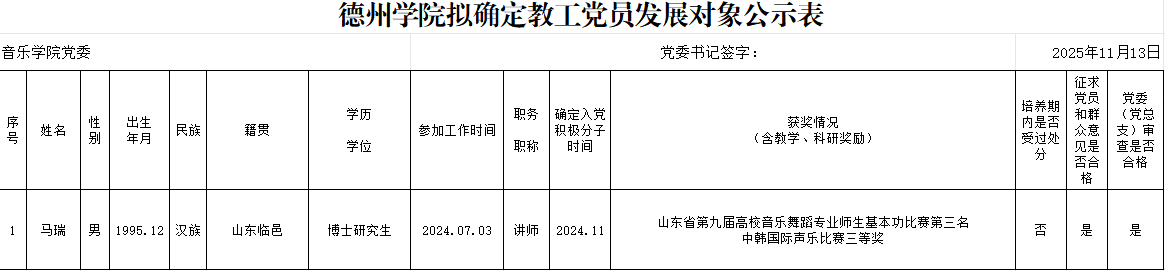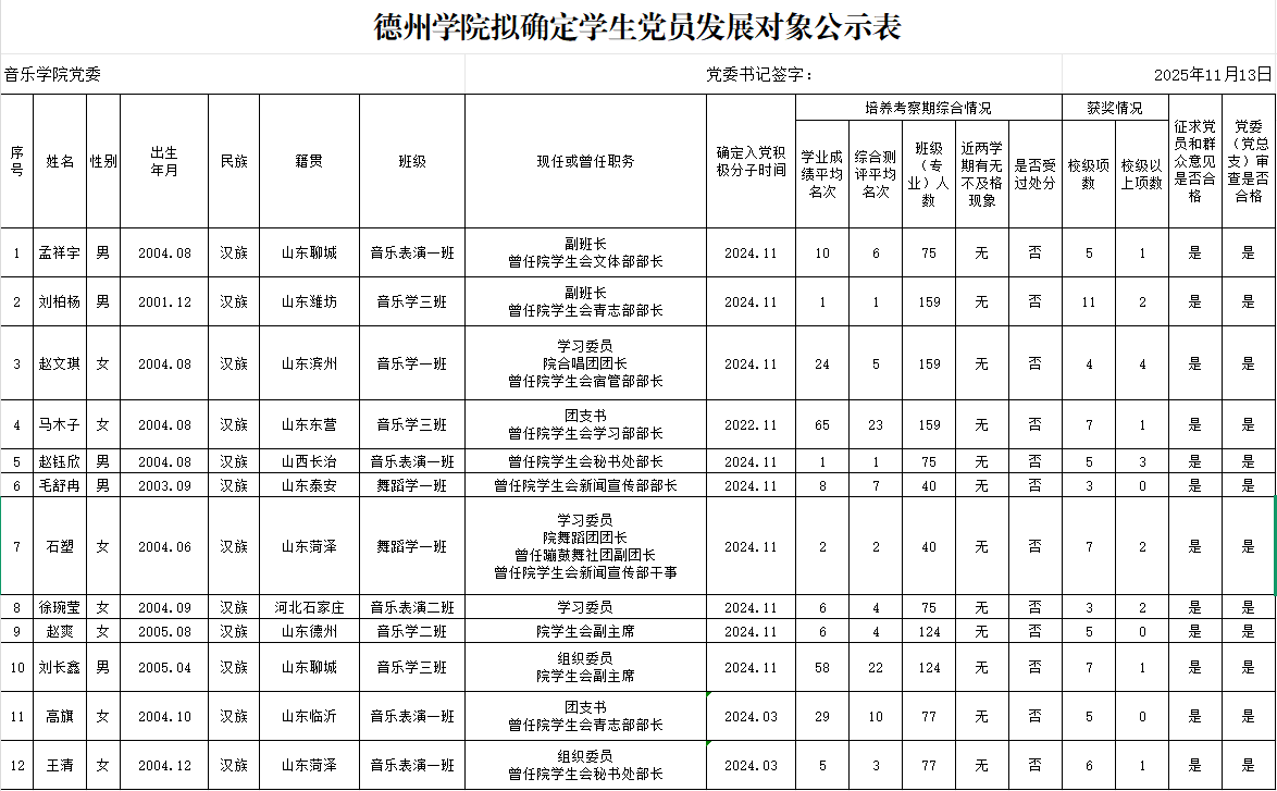 经党组织培养考察,征求党员、群众和培养联系人意见,支委会讨论研究、党委审查,拟确定孟祥宇等13人为党员发展对象。为增强发展党员工作的透明度,接受党内外群众的监督,确保发展党员的质量,根据上级文件精神和《中共德州学院委员会发展党员工作实施细则》的要求,现将拟确定发展对象的基本情况公示如下(名单附后):