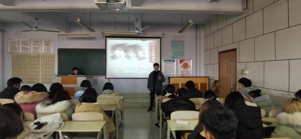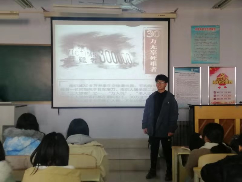 在活动上,宣讲人程伟东以“铭记历史,珍爱和平”为主题,开展了不同形式的纪念活动。从设立国家公祭日的目的意义、日本帝国主义侵华战争中所犯下的滔天罪行、中国军民奋力抗击侵略并取得伟大胜利等方面,播放PPT向同学们进行深入浅出地解说。