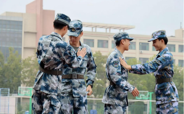 艰苦的军训当中,同学们互相帮助,互相拍打着彼此身上的灰尘和泥土,同时又好像是轻轻搭载彼此的肩上,传递着无声地鼓励和支持。在这段军训时光里,他们一同经历骄阳的炙烤和汗水的洗礼。这看似简单的动作,包含着战友间的情谊,是疲惫时的慰借,是前行路上的有力陪伴,互相关怀着对方,不断鼓励和帮助。
