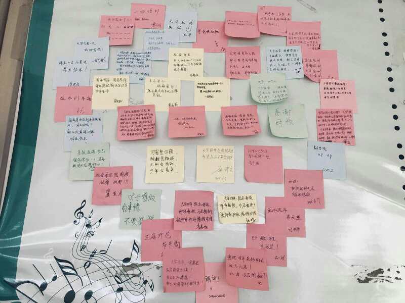 班会上,同学们踊跃发言,分享了自己大学四年的心路历程和所感所获,表达了自己对老师、学院、学校的感恩之情,描述了自己未来的规划愿景和发展目标。辅导员史璇对毕业生离校的各项工作进行了介绍和安排,并对即将离开母校的同学们提出了几点希望:谨遵校规,安全离校,展现良好精神风貌,共创文明和谐校园;铭记师恩,文明离校,彰显音乐人文情怀,以实际行动为母校献礼;调整心态,理性离校,不断挑战自我,成就社会价值。会后,同学们纷纷在便签上为母校留下了一句话。