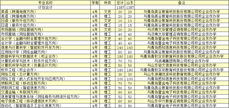 德州学院2018年普通本科校企合作办学专业招生计划