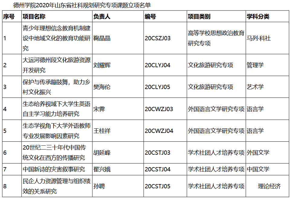 近日,2020年度山东省社科规划研究专项课题评审结果已正式公布,经过学科专家初评、会议评审组独立审阅、民主讨论、投票表决、公示等程序,最终评出全省立项课题552项。德州学院8位教师申报的课题获批立项,其中我院樊海伦副教授申报的课题获批立项,这是我院教师首次在此项课题上申报成功,取得了历史性突破。