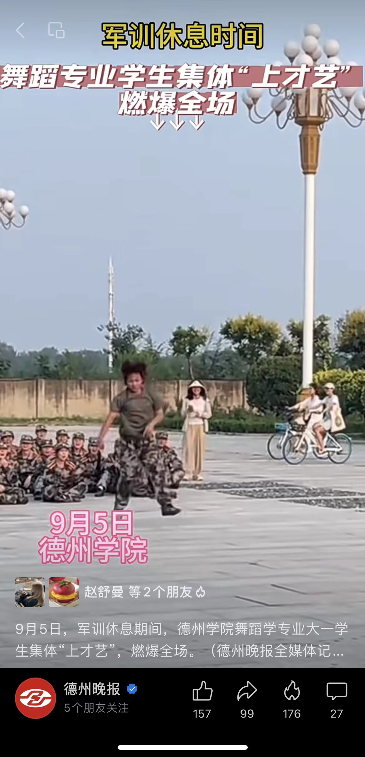【德州晚报】9月5日,军训休息期间,德州学院舞蹈学专业大一学生集体“上才艺”,燃爆全场。(德州晚报全媒体记者 袁明慧)