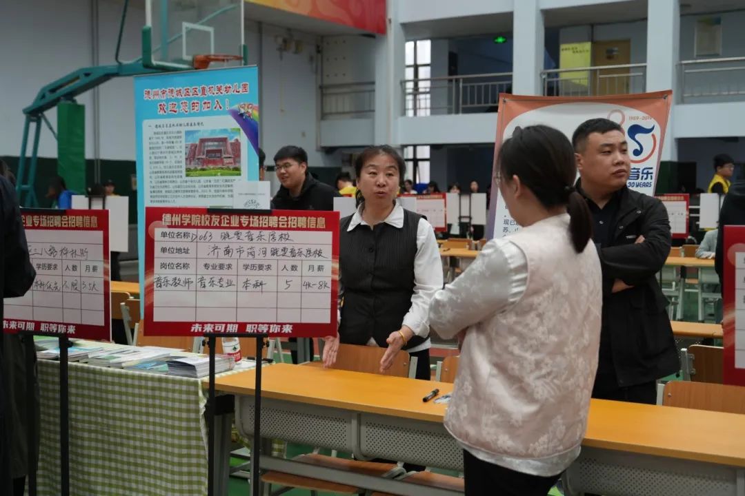 论坛期间,学校体育馆内热闹非凡。音乐学院校友企业、友好合作单位主动参加专场招聘会并吸纳2025届毕业生高质量充分就业。德州爱艺教育培训学校有限公司、德州市陵城区晓雯培训学校有限公司等5家单位向毕业生抛出橄榄枝,提供40余个需求岗位,覆盖所有专业。