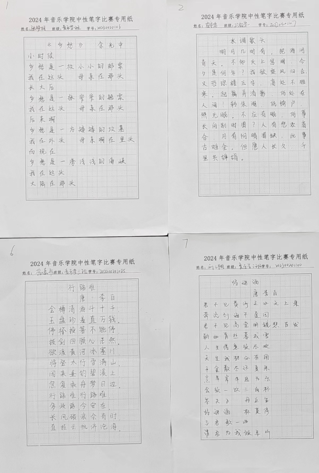 参赛者是音乐学系23级、22级全体师范生,比赛期间她们都使出了各自的“看家本领”,一笔一划,笔锋流畅、刚劲有力、工整清秀,充分展示了扎实的功底,给人以美的享受。各位评委老师们以专业的角度,高超的素质,本着公平公正公开的原则,进行评分,推选出各个年级钢笔、中性笔、粉笔的一、二、三等奖。