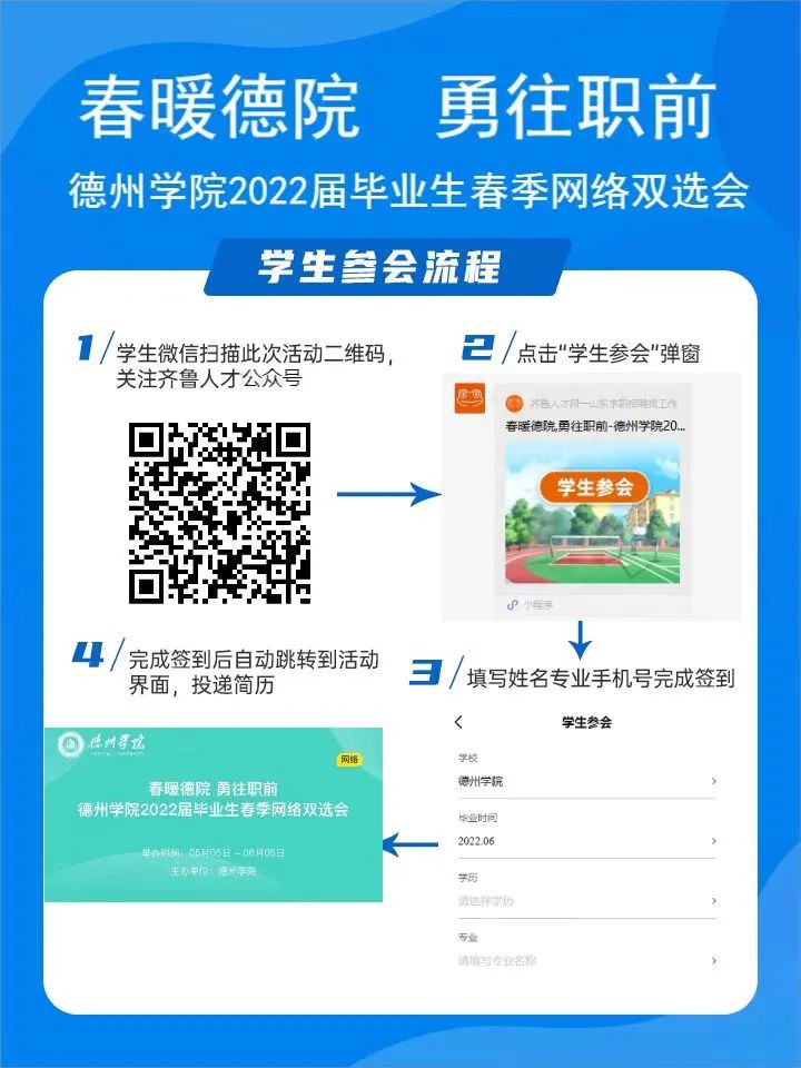 手机微信扫码关注“大众人才网”微信公众号,企业和毕业生分别点击相关按钮进入德州学院校招端口,点击报名按钮,注册或登录已有账号即可直接参与。
