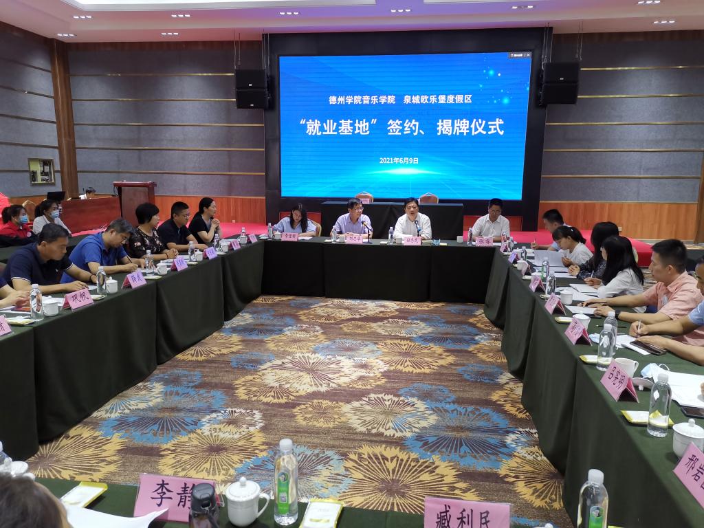 考察组一行受到企业的热烈欢迎。活动中,公司负责人致欢迎词,对公司的发展情况做了介绍。音乐学院主要负责人介绍了德州学院办学成就,音乐学院人才培养、毕业生就业情况等。校企双方都表达了对建立就业基地的愿望,并就今后深层次合作进行了深入交流研讨。与会人员一同观看了山东省坤河旅游开发有限公司的宣传短片。省文化和旅游厅科技教育处二级调研员田忠民主持会议并发表了热情洋溢的讲话。