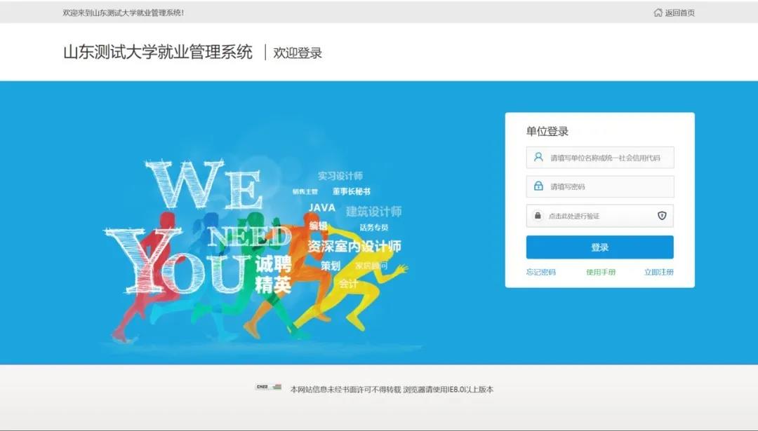 就业网首页,点击单位登录,输入账户名、密码登录即可。