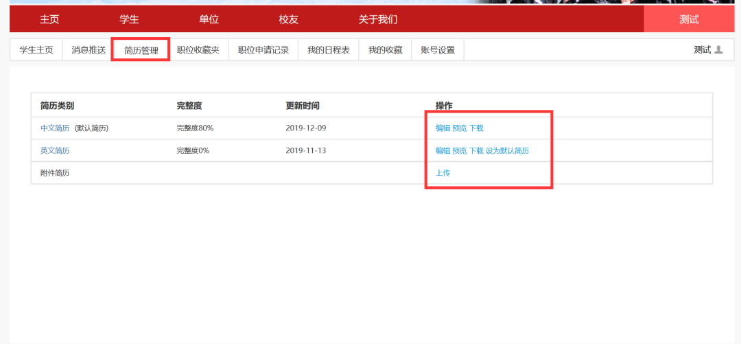 学生登录后,可在线制作简历(中文简历、英文简历),也可以直接上传附件简历。