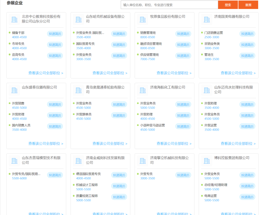 进入网络招聘会大厅,浏览与搜索参展企业与岗位,支持按单位名称、职位名称、需求专业等来搜索参展企业。
