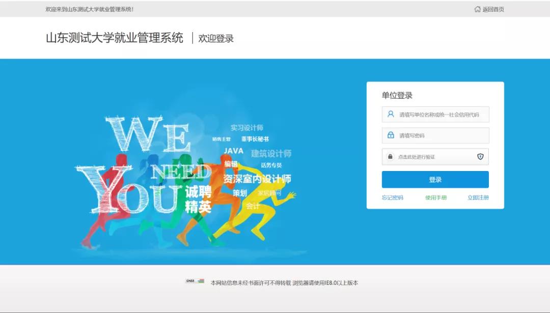 就业网首页,点击单位登录,输入账户名、密码登录即可。