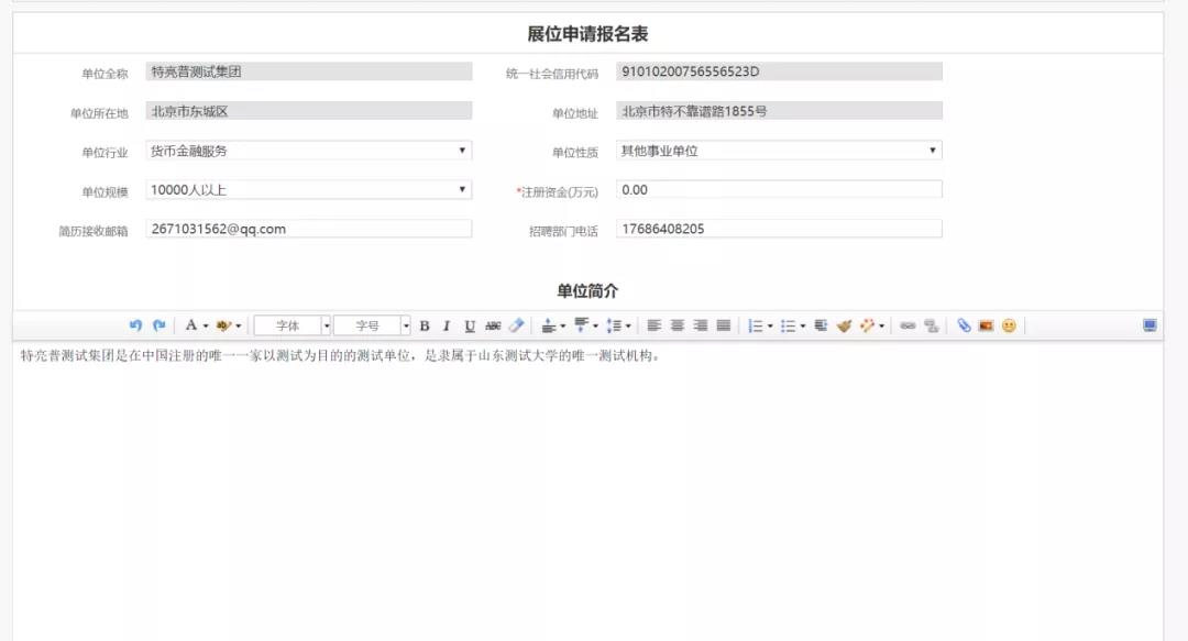 单位报名需填写简历投递邮箱、招聘部门电话还有招聘岗位等需求。