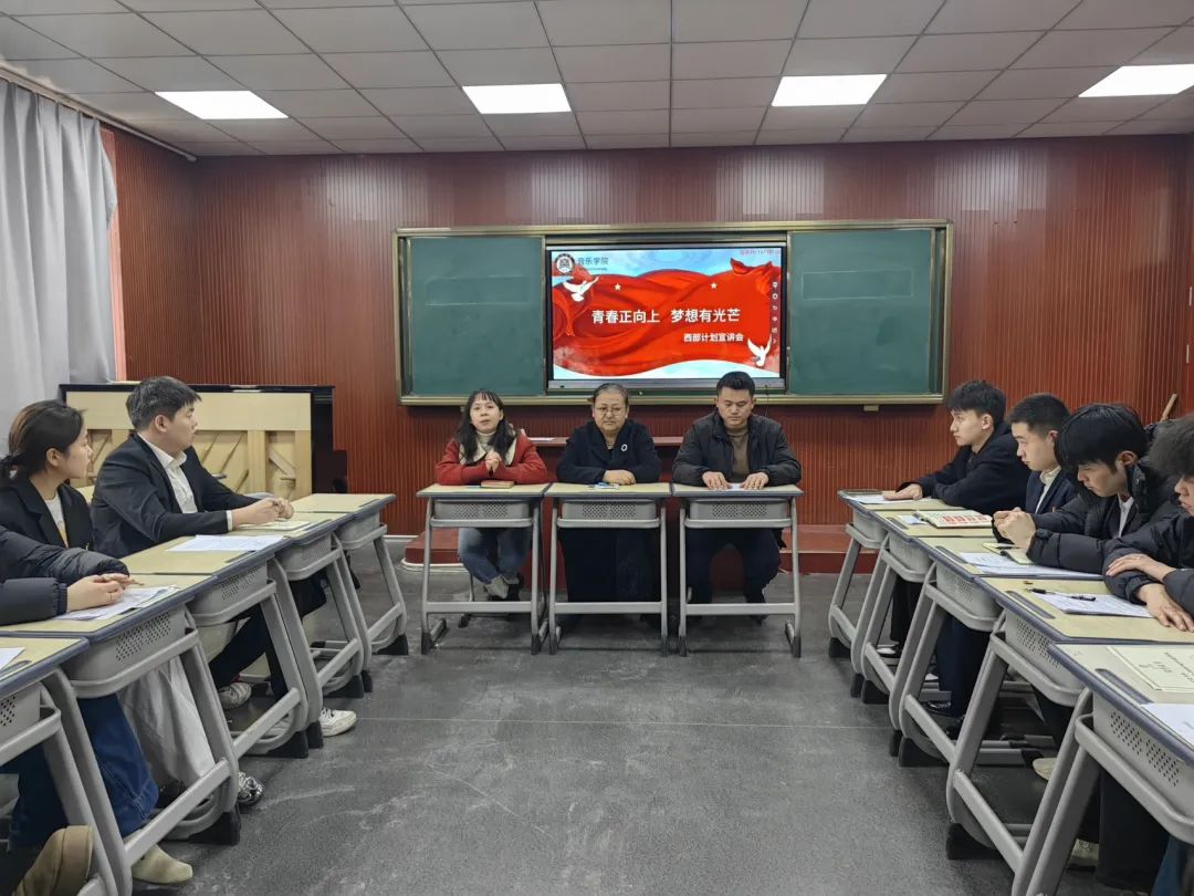 团委书记陈璨重点讲解西部计划相关政策,以优秀毕业生扎根西部为例,分享毕业生参与西部计划基层项目后的各种变化与机遇,引用毕业生工作感悟“艺术的价值不仅在于舞台聚光灯,更在于唤醒每一寸土地的文化生命力”,号召全体毕业生加入到大学生志愿服务西部计划项目中。辅导员则对本学期具体的就业活动开展进行梳理。