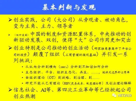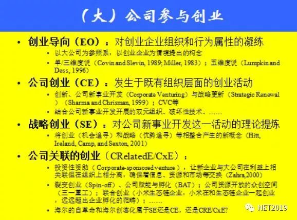 从实践层面看,面对上个世纪八十年代以来的创业热潮,大公司开始表现为观望者,在切身地感受到自身规模大、组织庞杂且僵化、灵活性不足而难以适应信息社会竞争的压力下,从克服“大企业病”的角度尝试开展战略创业、组织内新事业开发等与公司创业高度相关的创业活动,之后又大力开展内创业活动,积极推动组织变革,二元组织、扁平化、平台化、战略更新等新的举措不断涌现,到如今,大公司不仅自身积极创业还通过各种形式积极推动创业活动,一些新的尝试难以直接归纳到哪一类创业活动中,我简单地称其为与公司关联的创业(CRaletedE)或者中间体不清楚是什么的CxE。