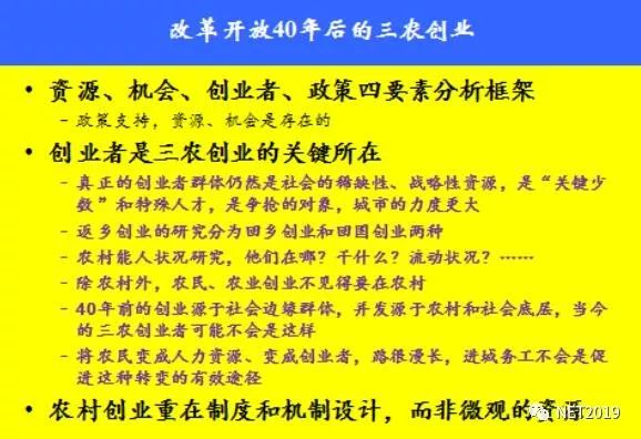 第三,三农创业、社会创业。有民宿的住宿价格已经超过城市五星级酒店的价格,就是乡村创业、三农创业兴起的信号。今年国家自然科学基金重点课题指南中,将三农问题纳入资助范围的课题数量大幅度增加。这不仅是国家大力推动乡村振兴、精准扶贫、农民工返乡创业等政策结果,也是经济、社会发展到一定阶段的产物。但是三农(农村、农民、农业)创业一定要考虑改革开放40年的发展基础,要多考虑三农创业的独特性和关键所在。
