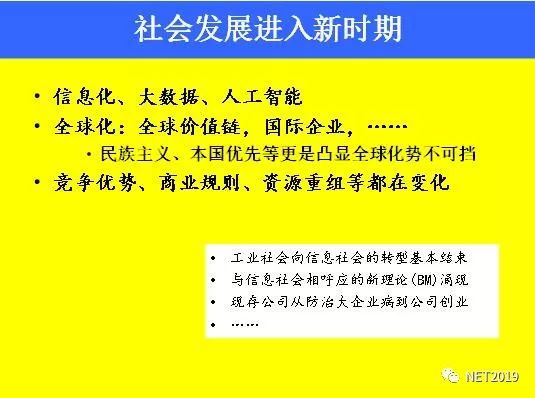 以前我总是习惯于把创业和社会转型联系起来,工业社会向信息社会转型给创业带来了巨大的机会,也带动了创业热潮。今后我不想说社会转型了,因为从工业社会向信息社会的转型基本结束,信息化、大数据、人工智能已经渗透到各个角落,制造服务几乎是一个词了。线上线下互动(O2O)、现代物流等不少产业和商业业态与工业社会没有什么联系;轻公司、组织生态化与工业社会时代的金字塔组织完全不同;商业模式、顾客体验、组织生态化等理论工具同样脱生于信息社会,与工业社会没有什么联系;社会发展进入了新的时期。这是新的起点。